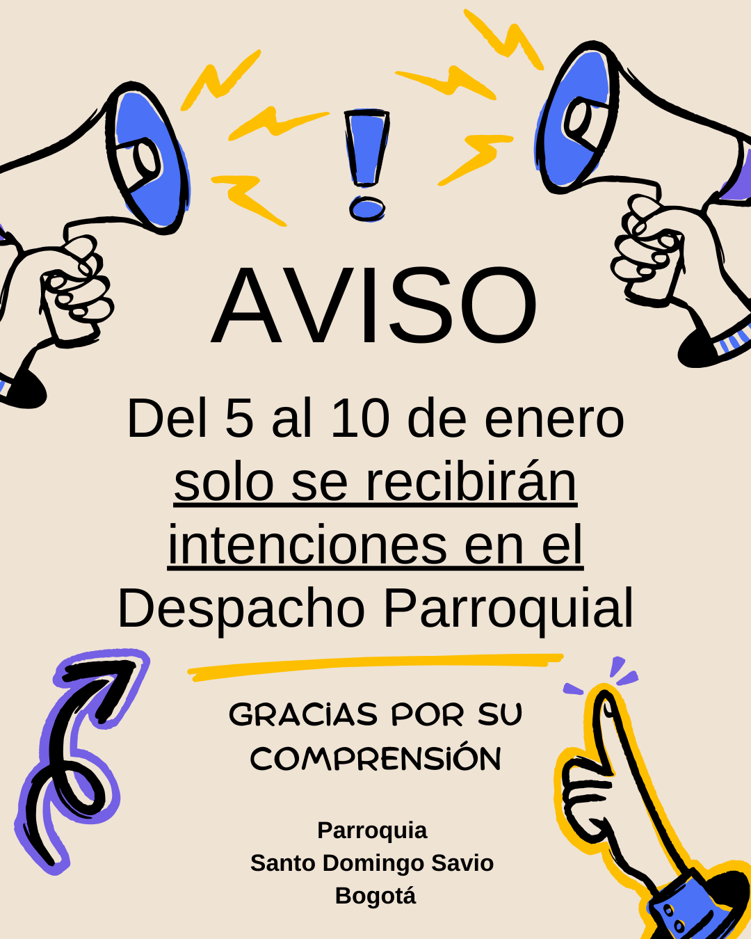 Atención del Despacho Parroquial 4 de Enero de 2026Del 5 al 10 de enero/26 solo se atenderá la recepción de intenciones para las eucaristías.La solicitud de partidas se atenderá una vez abra la Vicaría Episcopal Territorial de San Pedro el 13 de enero. Like 0 Dislike 0 Otros artículosActividades para el mes de enero25 de Enero de 2026Ten en cuenta cada una de ellas, compártelas con tu familia y amigos ¿Quien es el P. Daniel Saldarriaga?10 de Enero de 2026Conozcamos algo de nuestro nuevo párroco. Nació en Medellín un sábado santo, el 28 de marzo de 1964.