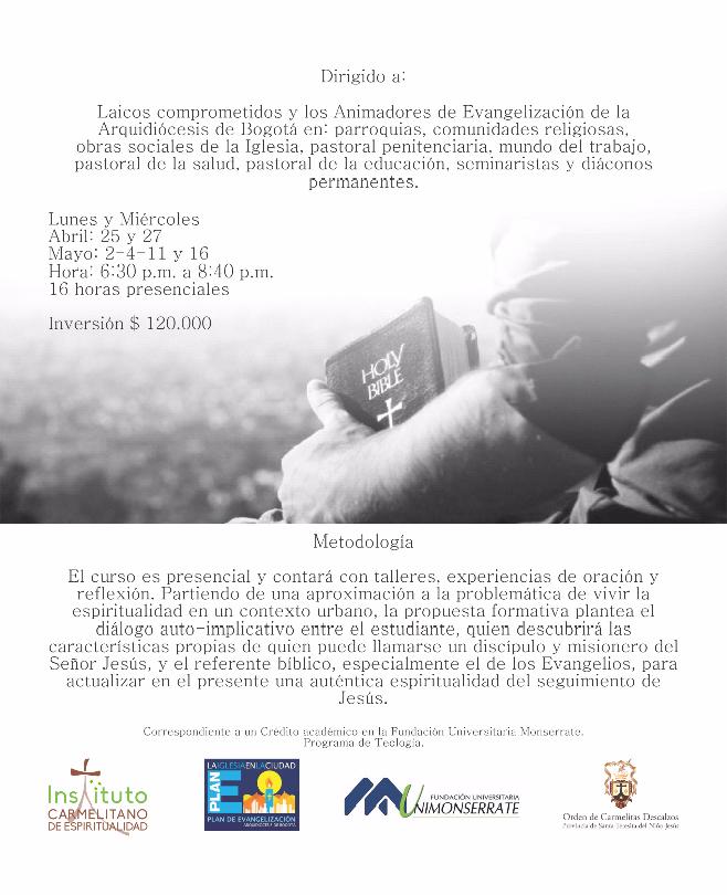 Con una propuesta presencial, experiencial y práctica, el curso aportará al crecimiento y fortalecimiento de la espiritualidad propia que exige el cambio de paradigma evangelizador en la Iglesia particular de Bogotá