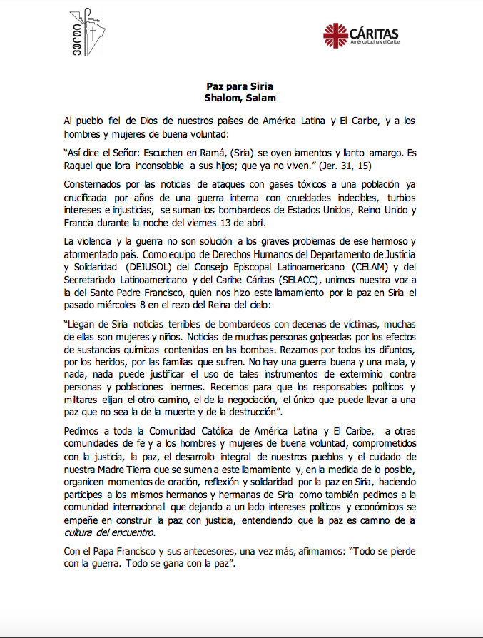 Así también, el DEJOSUL y la SELACC animan a la comunidad católica en América Latina y EL Caribe, a otras comunidades de fe y a los hombres y mujeres de buena voluntad "que se sumen a este llamamiento y, en la medida de lo posible, organicen momentos de oración, reflexión y solidaridad por la paz en Siria, haciendo partícipes a los mismos hermanos y hermanas de Siria como también pedimos a la comunidad internacional que dejando a un lado intereses políticos y económicos se empeñe en construir la paz con justicia, entendiendo que la paz es camino de la