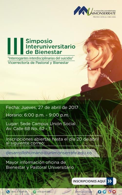 Centro de información Yo quiero Noticias Boletines Eventos Artículos Canonización Mensajes del Señor Cardenal Cartas pastorales Homilías Mensajes La voz del pastor Documentos del Vaticano NoticiasIII Simposio Interuniversitario de Bienestar "Interrogantes interdisciplinarias de suicidio"18 de Abril de 2017Inscripciones abiertas hasta el 20 de abril, mayor información oficina de Bienestar y Pastoral Universitario Like 0 Dislike 0 Noticias relacionadas La Santa Misa en Semana Santa La Arquidiócesis de Bogotá celebra el nombramiento de Monseñor Paolo Rudelli en la Santa Sede Prográmate