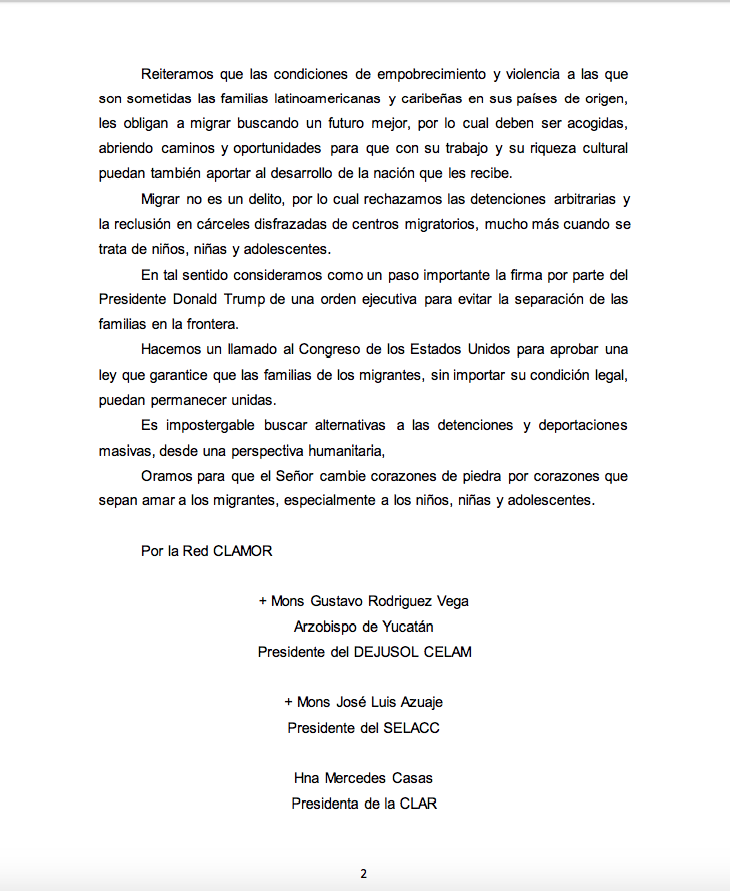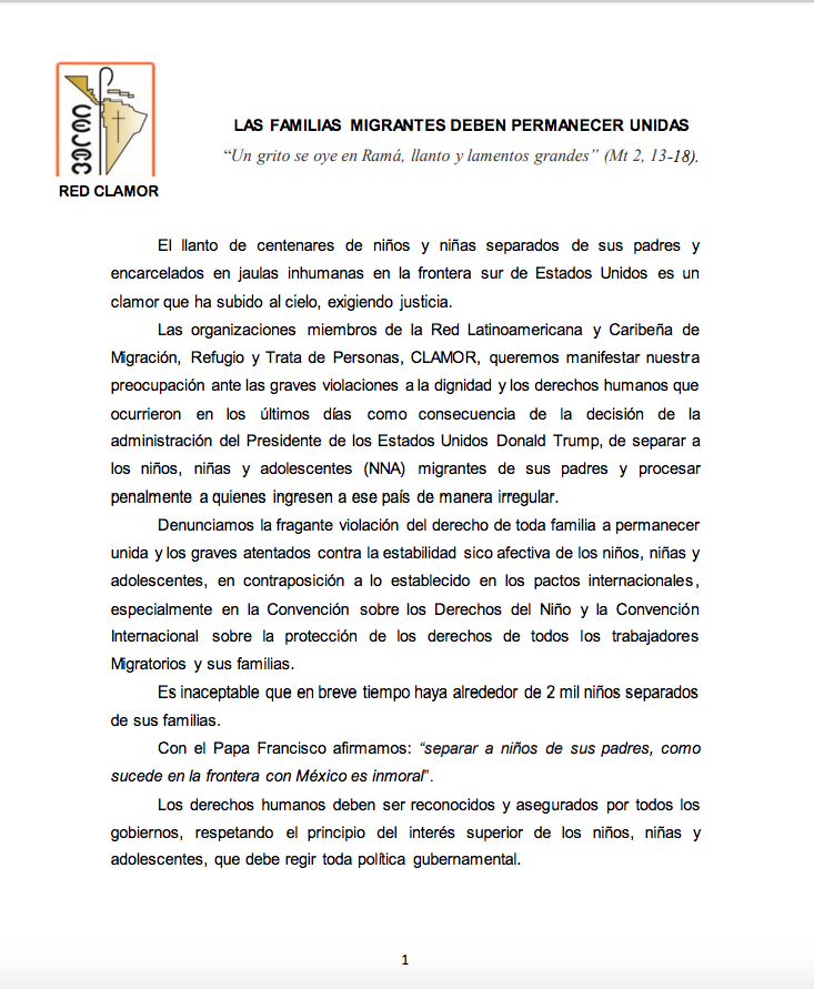 Centro de información Yo quiero Noticias Boletines Eventos Artículos Canonización Mensajes del Señor Cardenal Cartas pastorales Homilías Mensajes La voz del pastor Documentos del Vaticano NoticiasLas familias migrantes deben permanecer unidas21 de Junio de 2018Por medio de un comunciado las organizaciones miembros de la Red Latinoamericana y Caribeña de Migración, Refugio y Trata de Personas, CLAMOR, manifestaron su…Foto: http://www.ororadio.com.mx/ Like 0 Dislike 0 Noticias relacionadas Prográmate Arquidiócesis de Bogotá celebró el Día del Trabajador Católico 🙏🏻 ✝️ Del 29 de marzo al 5 de abril