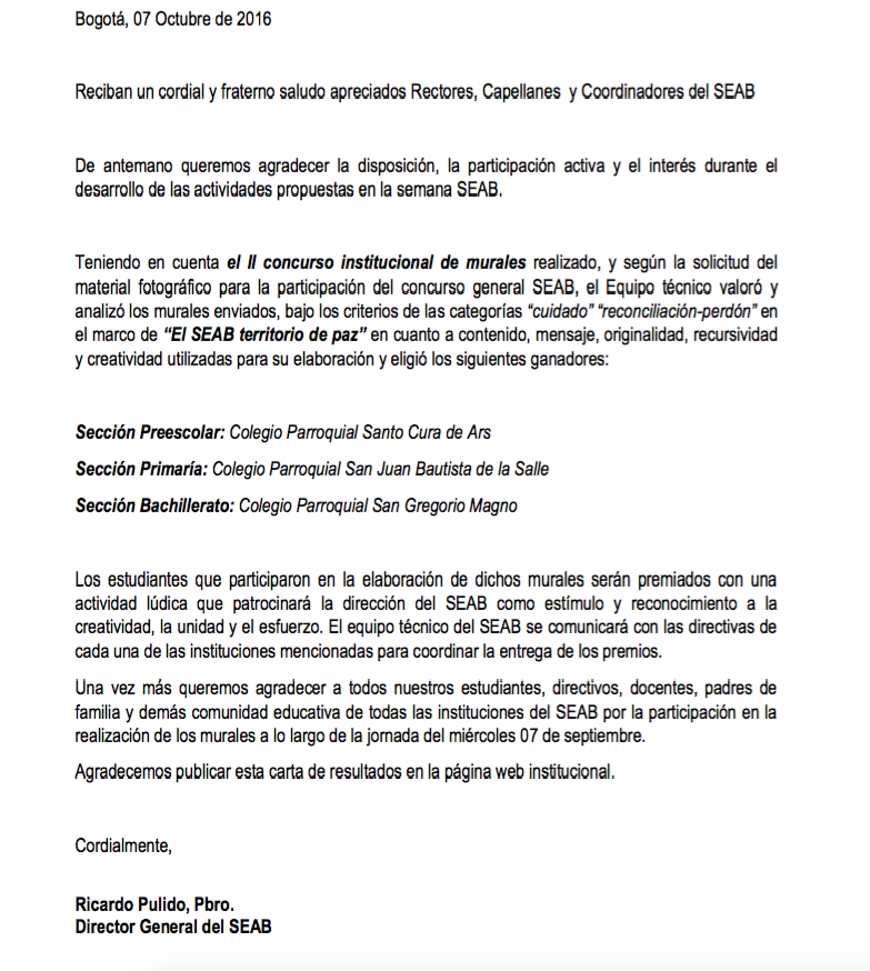 Centro de información Yo quiero Noticias Boletines Eventos Artículos Canonización Mensajes del Señor Cardenal Cartas pastorales Homilías Mensajes La voz del pastor Documentos del Vaticano NoticiasMurales ganadores II concurso13 de Octubre de 2016 Like 0 Dislike 0 Noticias relacionadas Archivo del Plan de Predicación - 2024-2025 Tiempo para nutrir, cuidar y testimoniar la fe La Arquidiócesis de Bogotá celebró la ordenación de nuevos sacerdotes y diáconos