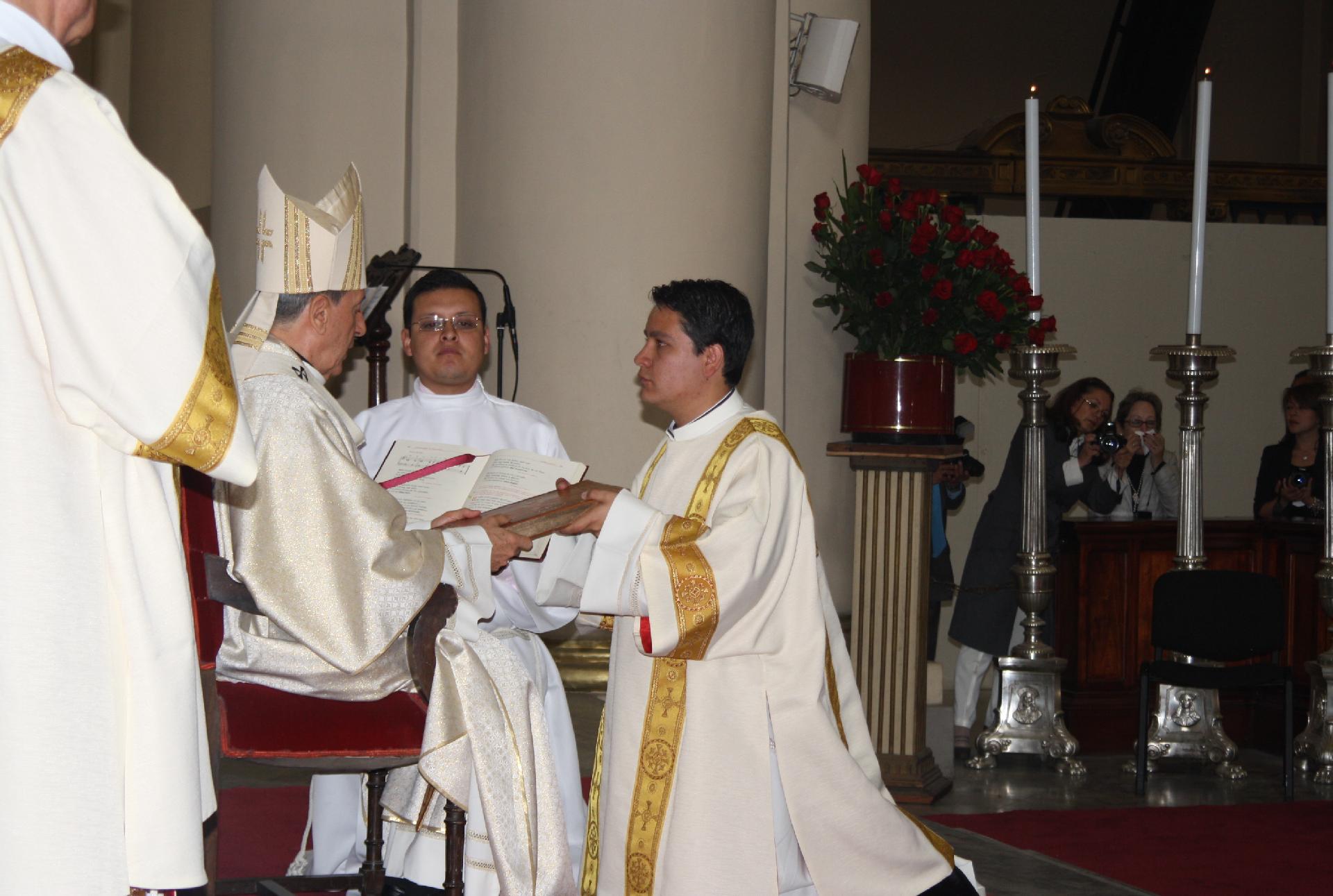 Ya con las vestiduras diaconales, se acercaron  al Señor Cardenal  quién les hizo la entrega del libro de los Evangelios, diciendo: Recibe el Evangelio de Cristo, del cual has sido constituido mensajero; convierte en fe viva lo que lees, y lo que has hecho fe viva enséñalo, y cumple aquello que has enseñado.