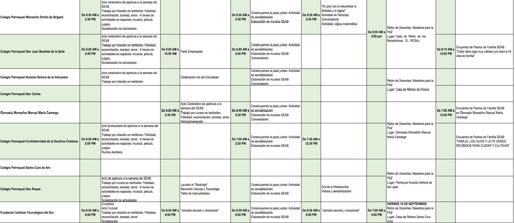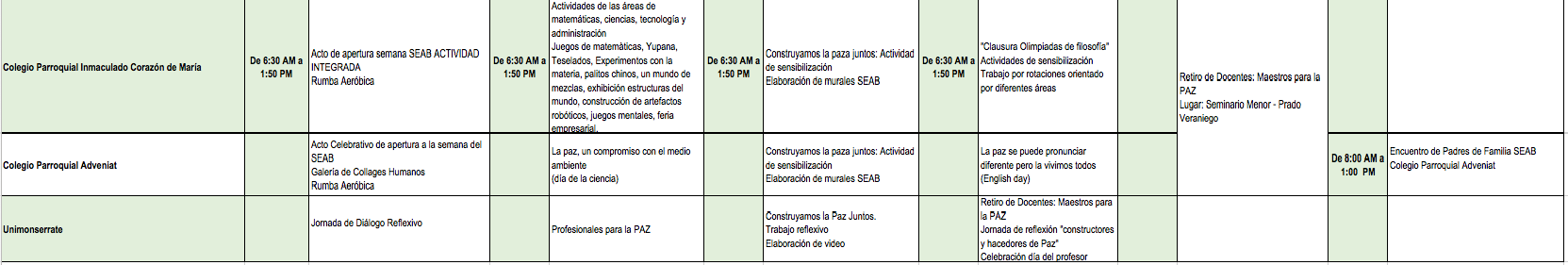 Centro de información Yo quiero Noticias Boletines Eventos Artículos Canonización Mensajes del Señor Cardenal Cartas pastorales Homilías Mensajes La voz del pastor Documentos del Vaticano NoticiasProgramaciónEl SEAB un territorio de Paz5 de Septiembre de 2016Descargue la programación a continuación:Programación semana del SEABDescargar Like 0 Dislike 0 Noticias relacionadas Archivo del Plan de Predicación - 2024-2025 Tiempo para nutrir, cuidar y testimoniar la fe La Arquidiócesis de Bogotá celebró la ordenación de nuevos sacerdotes y diáconos