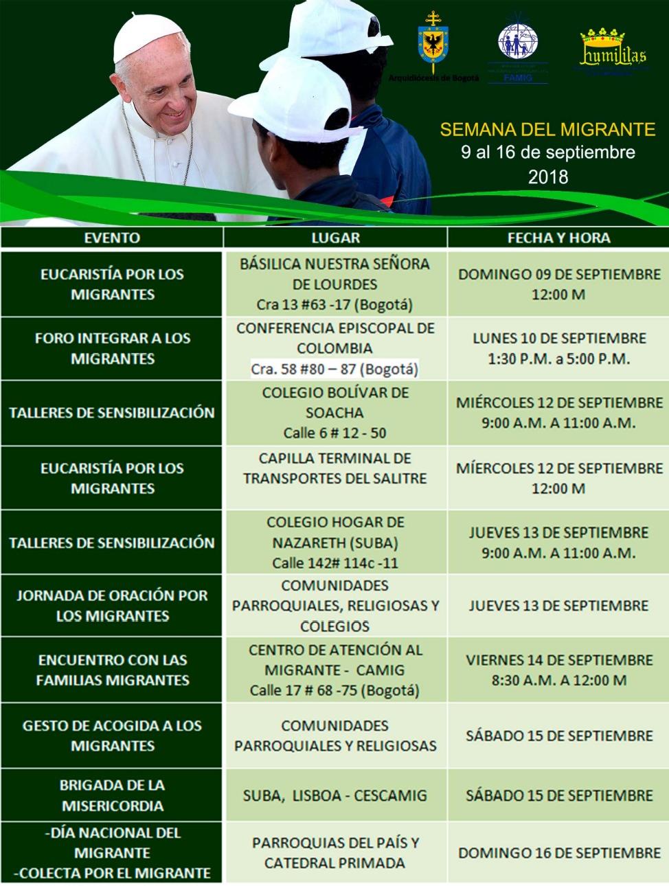 Nuestra arquidiócesis de Bogotá siguiendo la propuesta del Santo Padre ha querido celebrar la SEMANA POR LA PAZ y la SEMANA DEL MIGRANTE 2018 no en una sola semana, pero sí de manera articulada con el lema ACOGER AL MIGRANTE ES UN CAMINO PARA LA PAZ, también como respuesta que está viviendo nuestra ciudad con la presencia de miles de migrantes venezolanos.