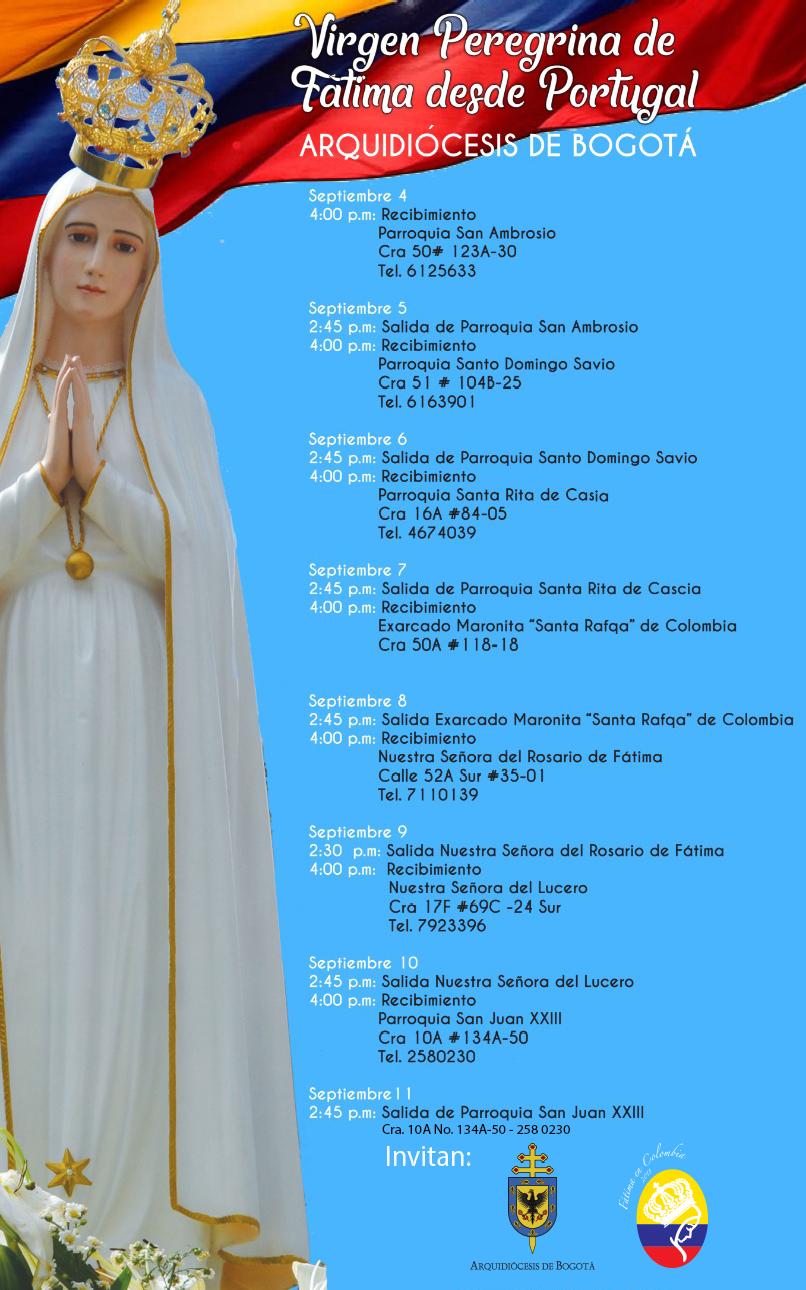 Centro de información Yo quiero Noticias Boletines Eventos Artículos Canonización Mensajes del Señor Cardenal Cartas pastorales Homilías Mensajes La voz del pastor Documentos del Vaticano NoticiasVirgen peregrina de Fátima visita Arquidiócesis de Bogotá5 de Septiembre de 2018La imagen peregrina de Nuestra Señora del Rosario de Fátima que llegó a Colombia desde el pasado 27 de abril y que se encuentra visitando diferentes diócesis del pais,… Like 0 Dislike 0 Noticias relacionadas Prográmate Arquidiócesis de Bogotá celebró el Día del Trabajador Católico 🙏🏻 ✝️ Del 29 de marzo al 5 de abril
