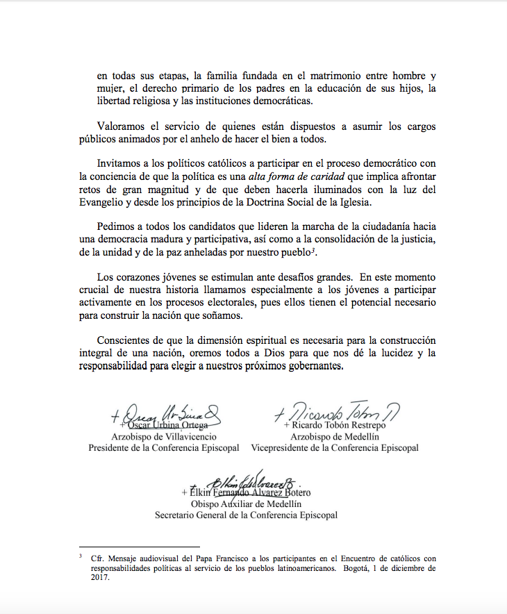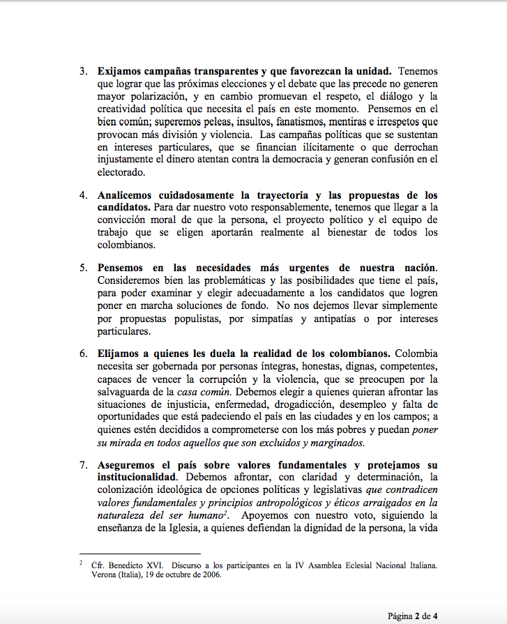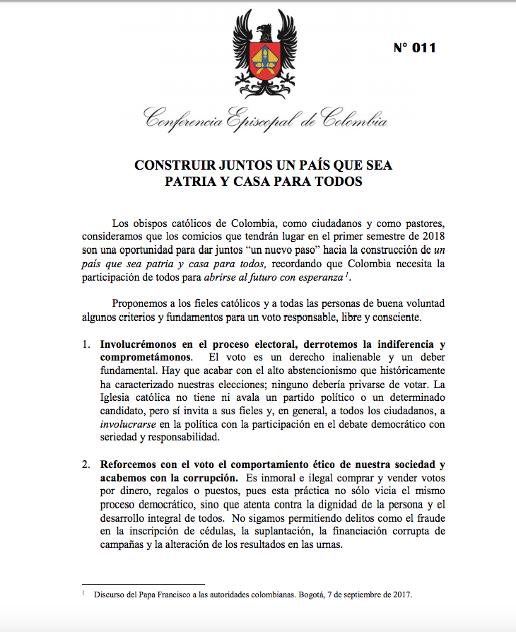 Centro de información Yo quiero Noticias Boletines Eventos Artículos Canonización Mensajes del Señor Cardenal Cartas pastorales Homilías Mensajes La voz del pastor Documentos del Vaticano NoticiasVotemos a conciencia y con responsabilidad15 de Junio de 2018Los obispos católicos de Colombia recuerdan a todos los fieles que, como ciudadanos y como cristianos, debemos votar consciente, libre y responsablemente Like 0 Dislike 0 Noticias relacionadas Prográmate Arquidiócesis de Bogotá celebró el Día del Trabajador Católico 🙏🏻 ✝️ Del 29 de marzo al 5 de abril